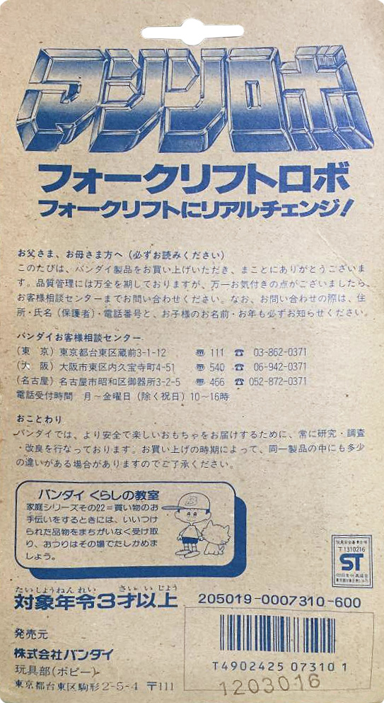 This model was originally designed in Japan by Bandai and released for their Machine Robo Series line as Forklift Robo. By this time Tonka's successful rebranding to 'Gobots' and US distribution saw the now more established name 'Spoons' applied and adopted for Robo Machine in Europe; predominantly to benefit from the Challenge of the Gobots cartoon. Multilingual Robo Machine cardbacks display both Fork-Lift and Spoons in the name section and the figure was released very late in the line's run vs. the Gobots distribution.