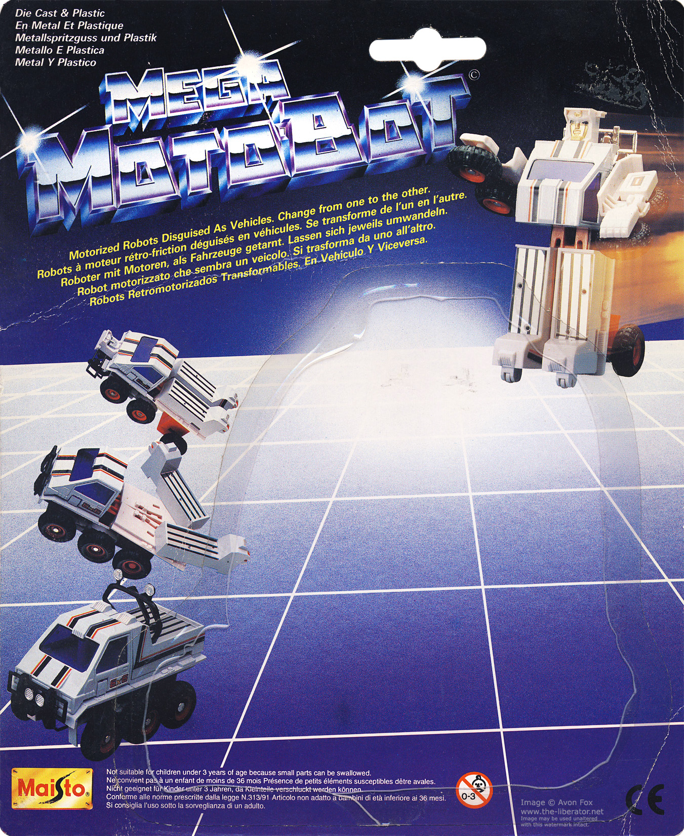 * Release Date details on these releases, the dates of release and extent of distribution is largely unconfirmed. 1990 was a transitional period for MC Toy while they incorporated the existing company Maisto. By 1996 the MC Toy logo had been replaced on cardbacks with Maisto's. For the MC Toy Mega Moto-Bots, the card art and comparison to other releases by MC Toy at the time likely places them late 80s'. The Maisto line is more of a mystery. Based on other Maisto releases of these MC Toy figures, the date would be around 1996/1997. Unfortunately some confusion is added by the sticker on the rear of the cards relating to a French import company named Concept Masters International. That business doesn't appear to have been registered until 2015. Maisto started phasing out their gold logo in the late 2000s/early 2010s, so possibly Concept Masters imported some old stock and these examples aren't indicative of the true Maisto Mega Moto-Bot run date. That said, at time of writing (2026), Maisto is still in business and could have re-issued a batch of these toys using the original card art or as above, moved some long dead stock. A release date and examples without this sticker are yet to be found. Footnote: Maisto do still occasionally use the gold logo on a select few Collector/Special Editions.