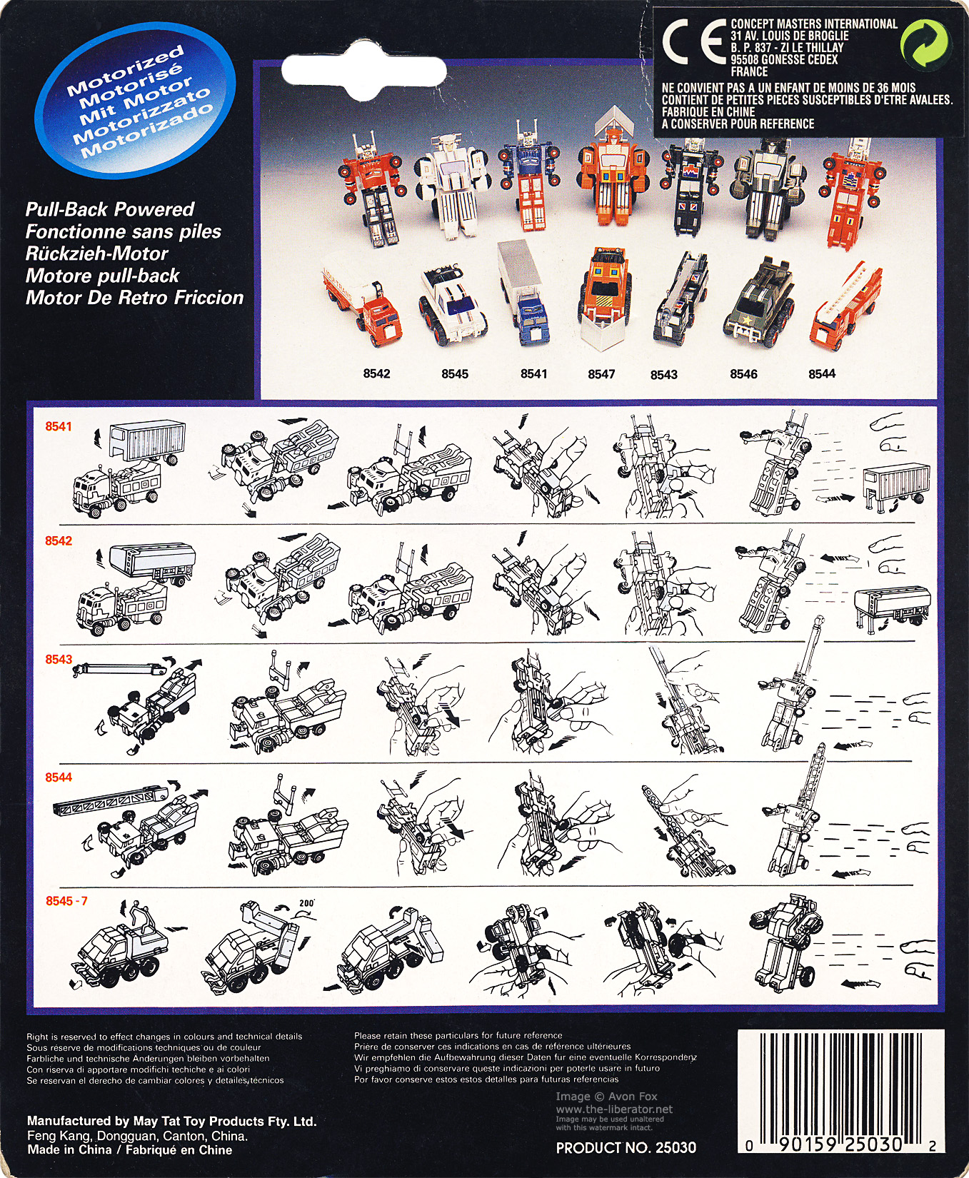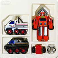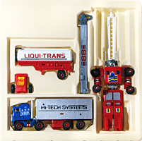 Box Sets were released for some of the articulated trucks and All-Terrain Trekker models in the MC Toy run. The truck set contain the Fire Truck and Container Truck figures along with the Fire Truck ladder, Crane Truck boom arm and the Tanker Truck's back. Only this this set of trucks has been sighted so far and the intent seems to be for the parts to be mix-n-matched vs. their originally intended release. The white Liqui-Trans back and Crane Truck boom will attach to either supplied figure. Box sets for the Maisto release have not yet been sighted.