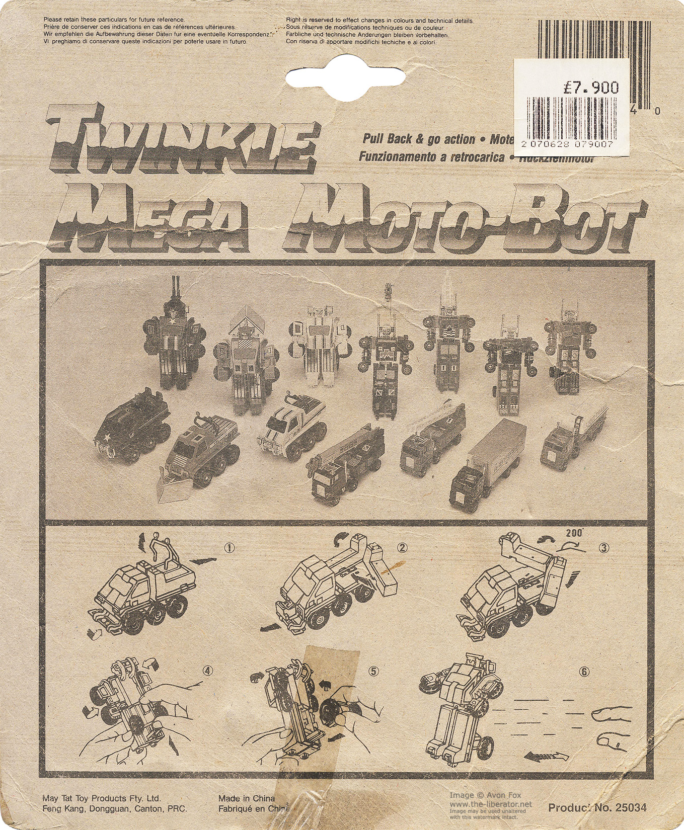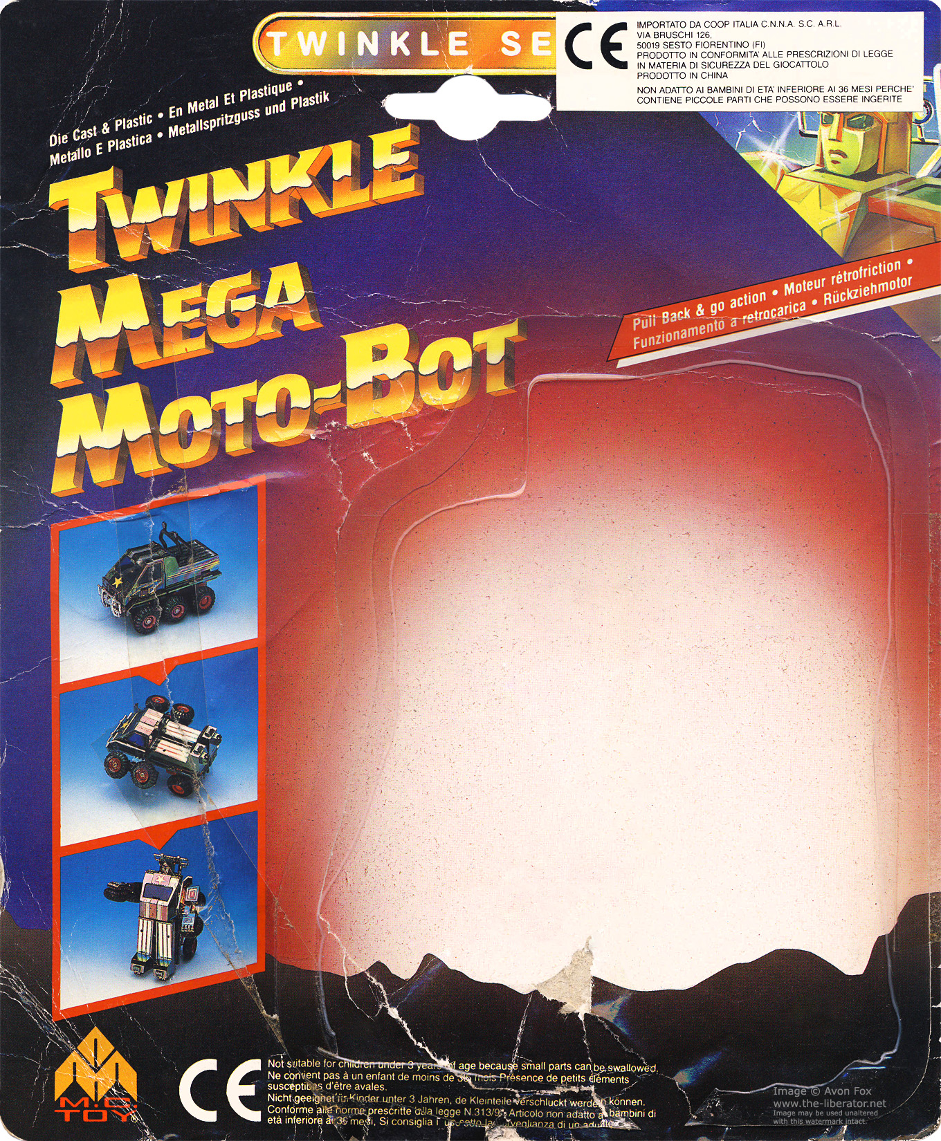 While Twinkle Motorized Robot appears to have been retailed via Woolworths in the United Kingdom, Twinkle Moto-Bot was at the very least sold in Italy where that retailer doesn't operate. The multilingual cardback text suggests they were possibly sold in other parts of Europe as well.