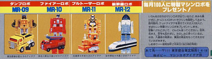 The text includes details of a competition where entrants could suggest new models to become Machine Robo Series toys; asks for participant's age, address, etc. The top banner says that one hundred lucky entrants per month would be sent a special Machine Robo Figure. Entries finalised end of February 1983.