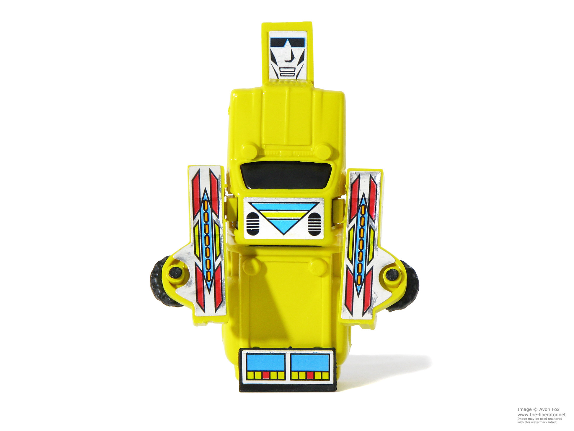 They're endearingly goofy, compounded by the MC Toy faces having been replaced with foil paper stickers. They also all have new, brightly colours foil body stickers. None of this Gisima line retained the pull back motors MC Toy's figures were best remembered for and simply stand up on the back panel of the vehicle.