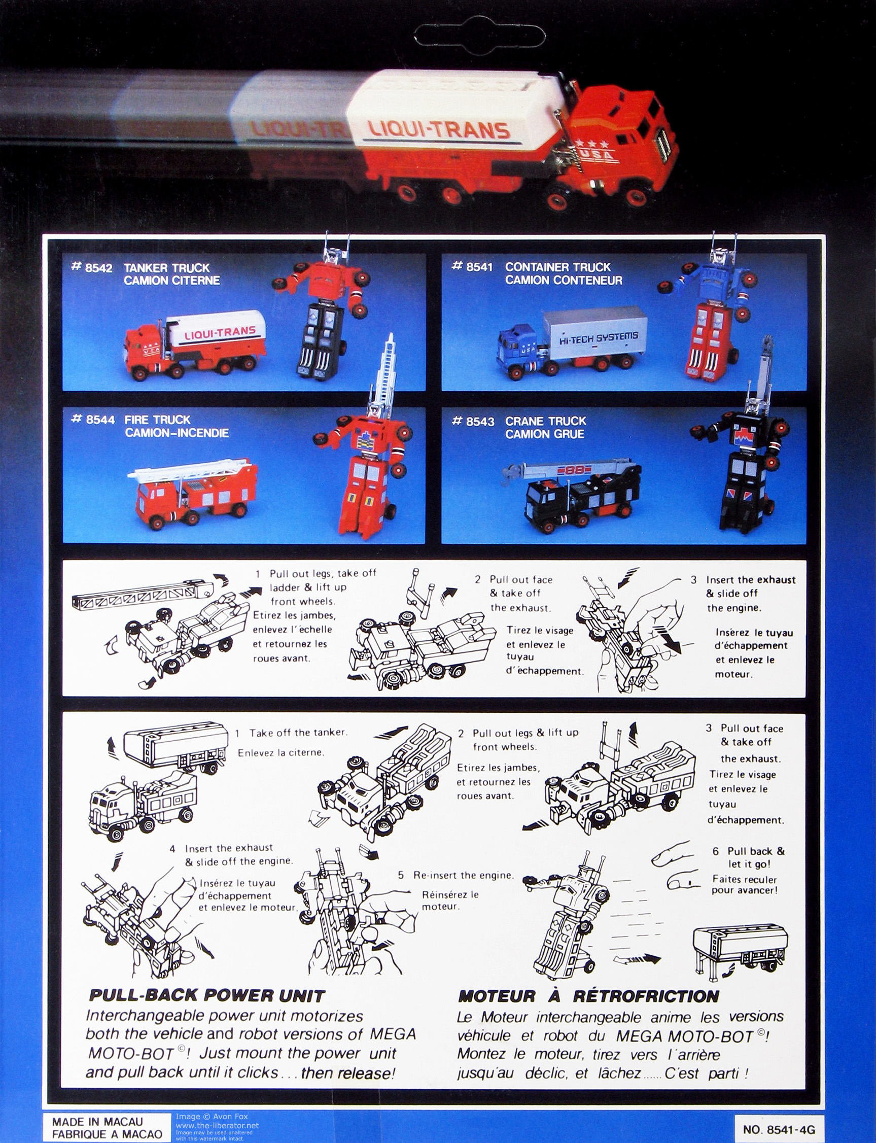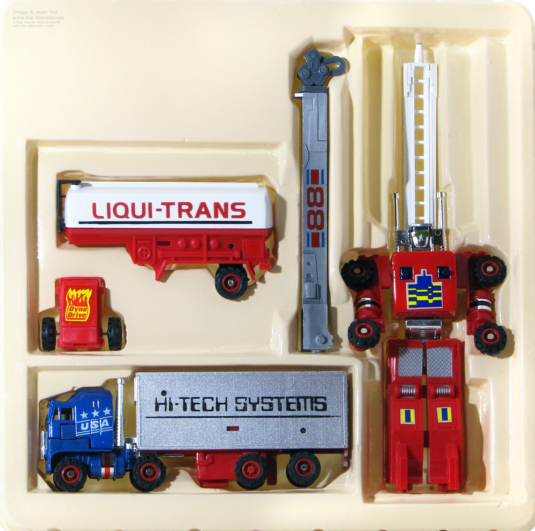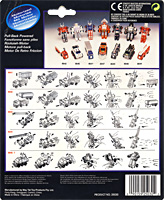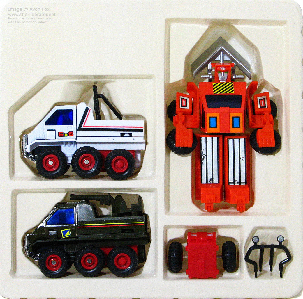 Box Sets were released for some of the articulated trucks and All-Terrain Trekker models in the MC Toy run. The truck set contain the Fire Truck and Container Truck figures along with the Fire Truck ladder, Crane Truck boom arm and the Tanker Truck's back. Only this this set of trucks has been sighted so far and the intent seems to be for the parts to be mix-n-matched vs. their originally intended release. The white Liqui-Trans back and Crane Truck boom will attach to either supplied figure. Box sets for the Maisto release have not yet been sighted.