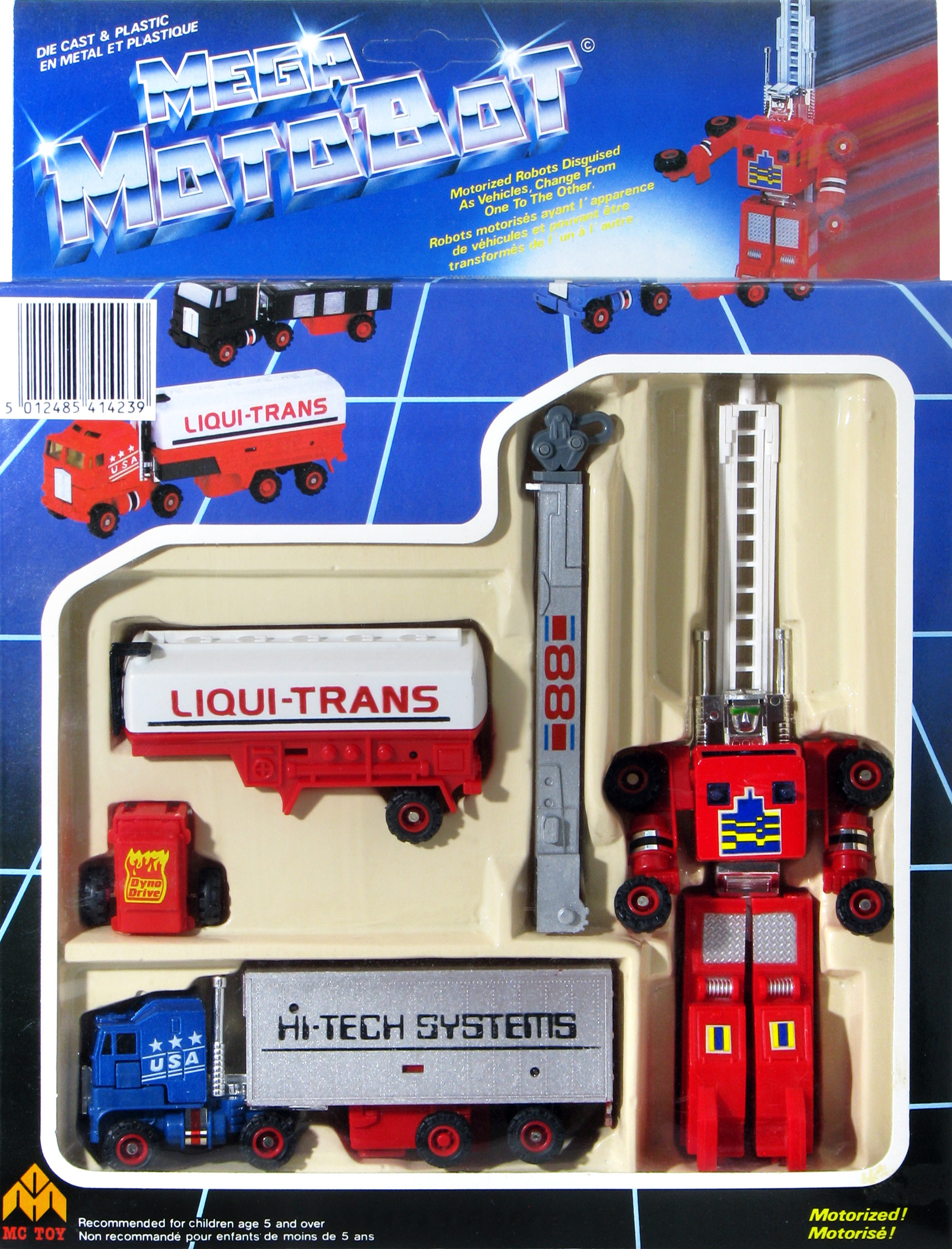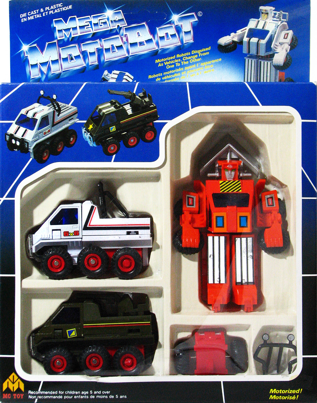 This Mega Moto-Bot line is a re-release of the 80s Mega Moto-Bot figures previously in part distributed in the United States by Intex under the same title and Grand Toys in Canada as Dynabot; see other pages this section.
