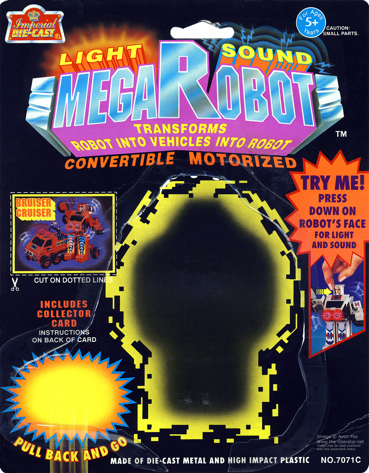 MegaRobot (Light Sound) is an extension with extra gimmick of Imperial Die-Cast's 1993 SupeRobot line (see separate page this site) that in itself was a re-re-distribution of MC Toy's original models now in new colours. The line was wholesaled direct from Imperial Die-Cast in the United States and Canada, while Titan Toys INT LTD were responsible for the United Kingdom distribution.